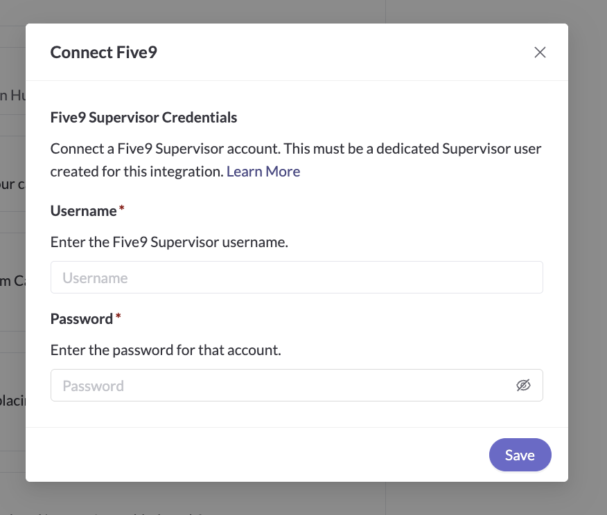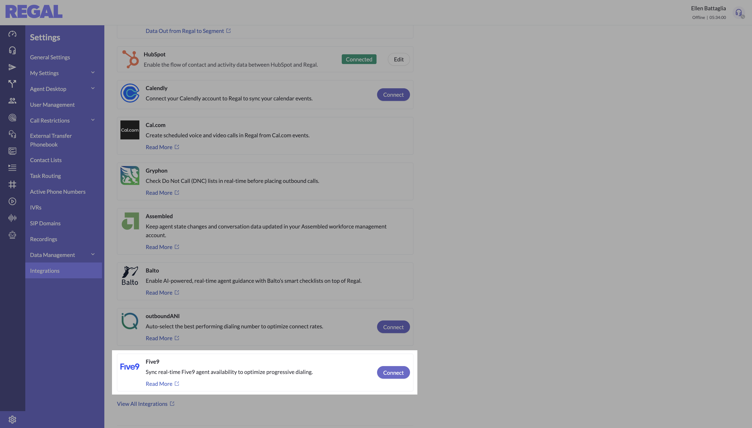 Important: This account should only be used for integration purposes. Logging into this account directly (e.g. via the Five9 UI) will temporarily break Regal’s connection. Do not use a shared or personal supervisor account.