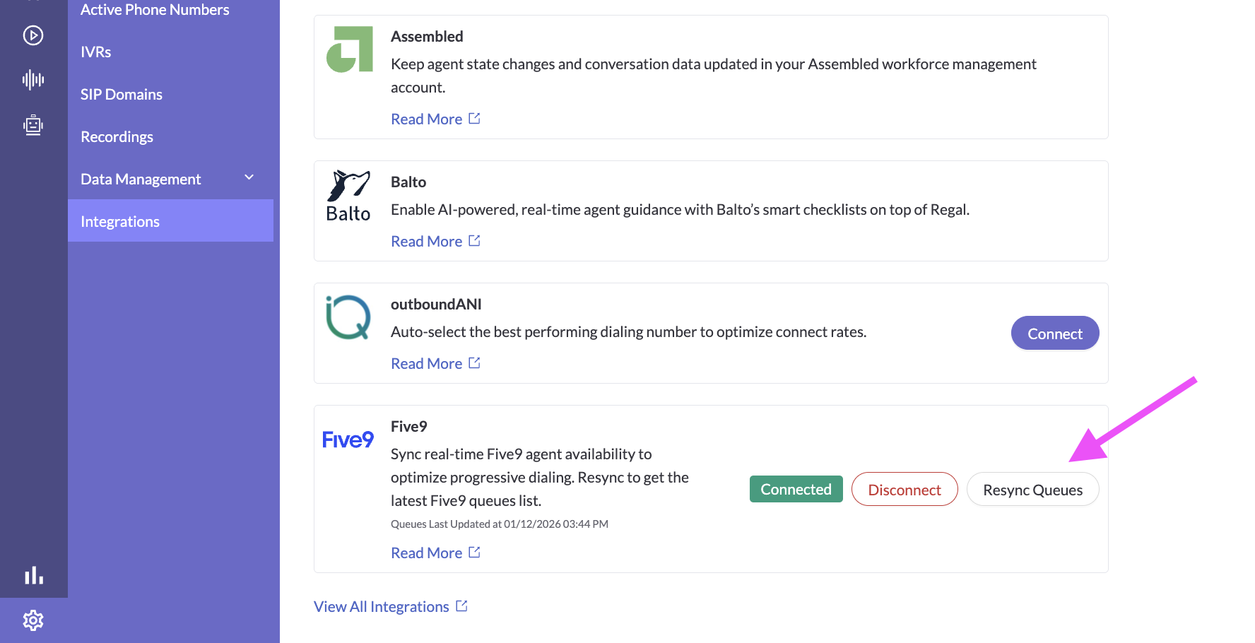 If you add, remove, or edit your Five9 queue (skills) that are relevant for Transfer-Aware dialing, you must resync your queues with Regal.