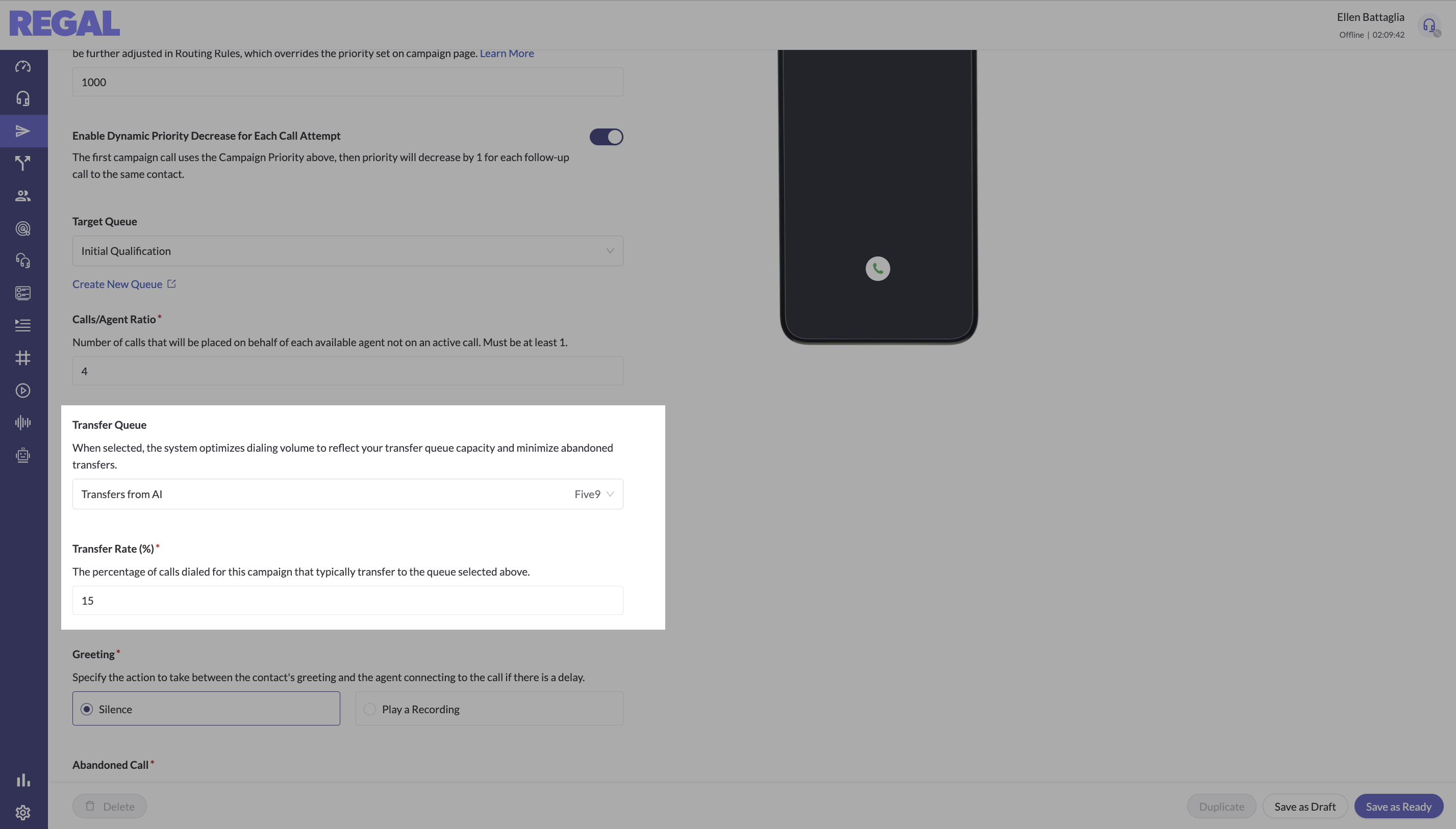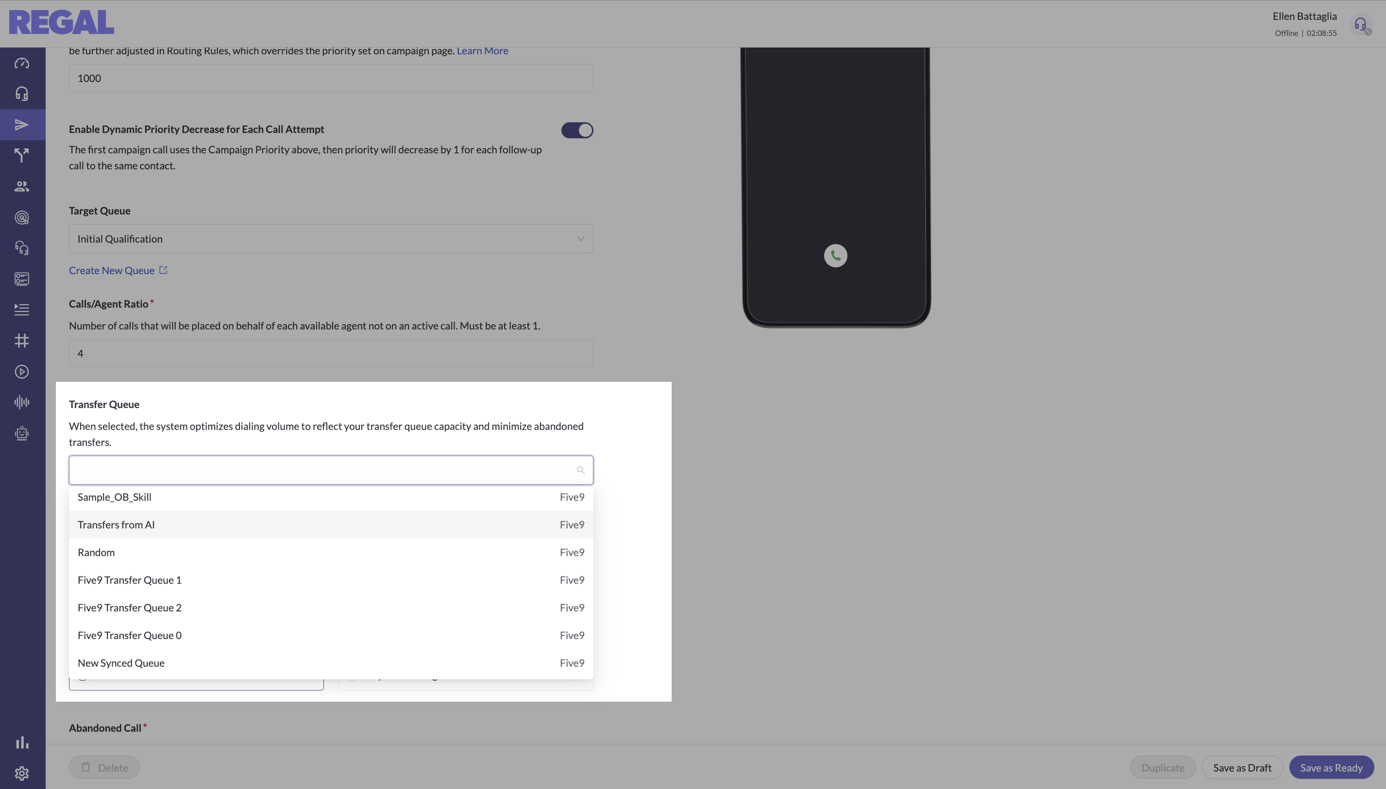 Regal's Transfer-Aware Dialing with Five9 allows you to maintain high dialer throughput while minimizing overwhelm to your transfer agents. This is perfect for outbound qualification flows where: