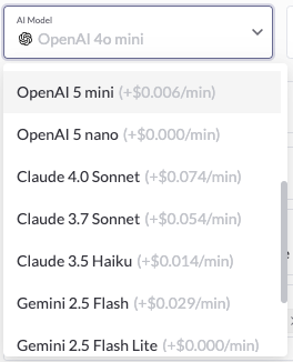 We recommend starting with OpenAI GPT-4o Mini, Regal's default model. Then, progressively upgrade to higher-performing or more specialized models (e.g., GPT-4.1 Mini, GPT-4.1, GPT-4o, or the new GPT-5 series) only if you find that your AI agent isn’t performing the call as well as you’d like and you’re willing to pay more.