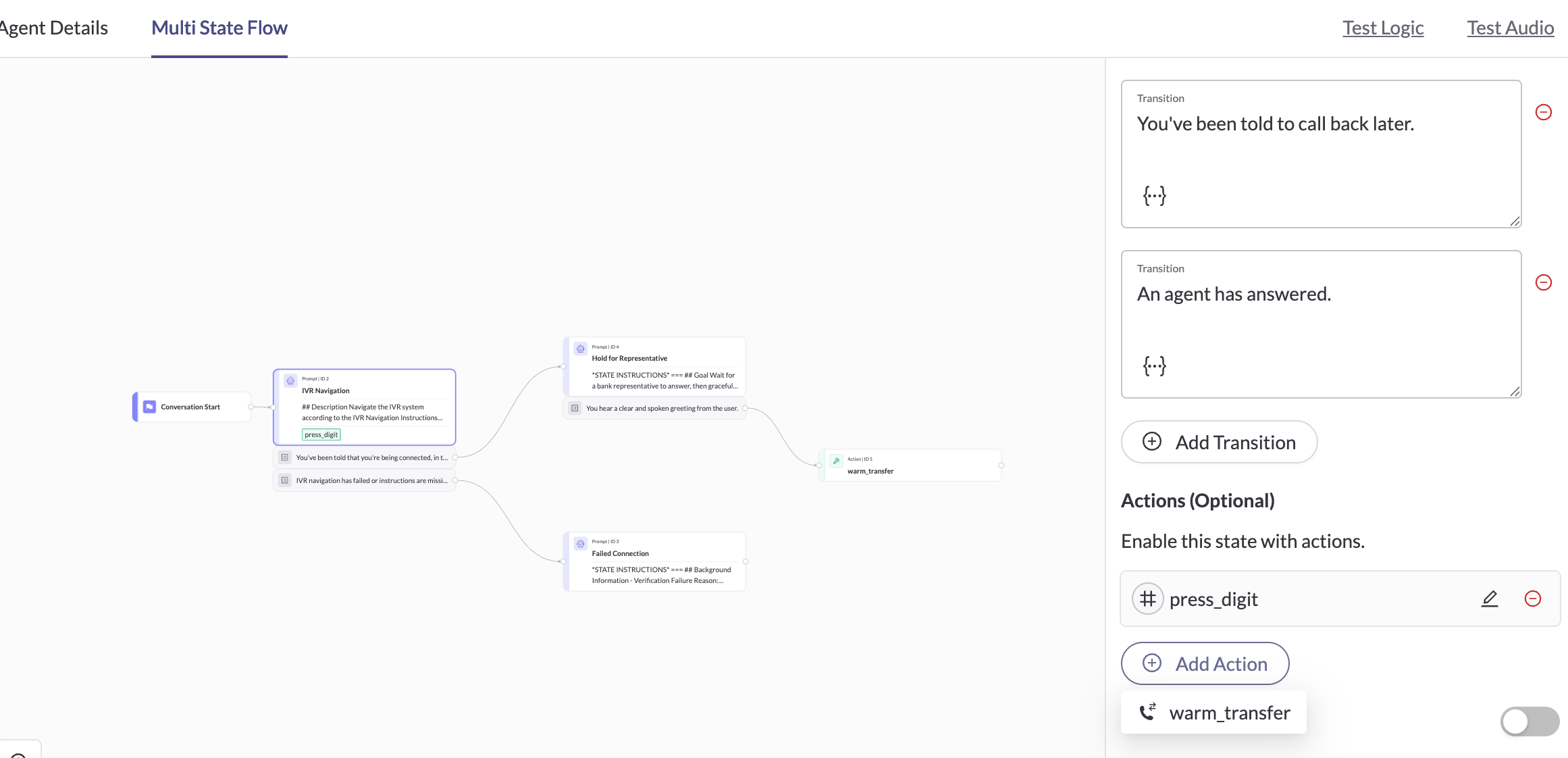 - Define transition conditions to move to the correct next node based on outcomes.