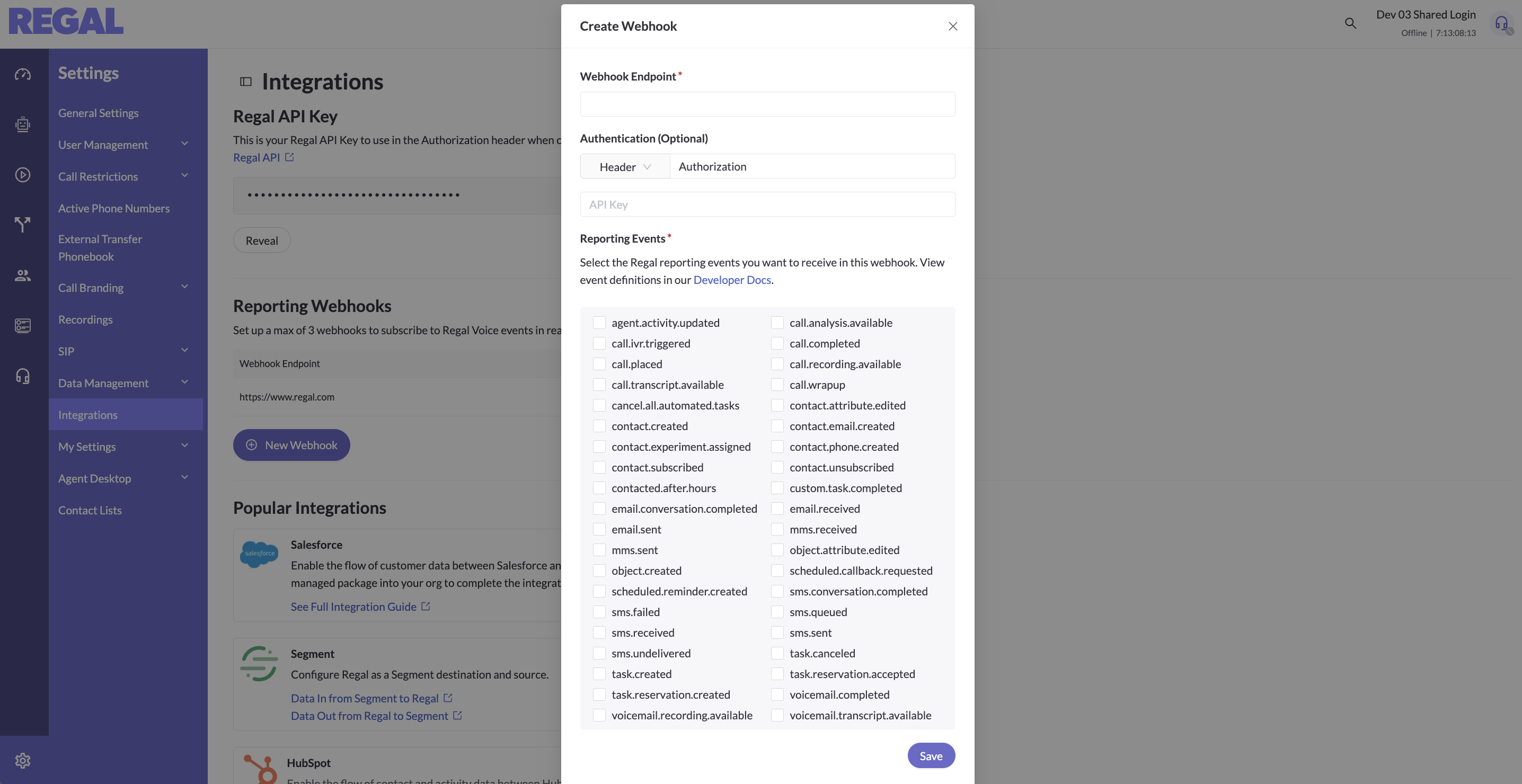- Enter the URL of the endpoint you'd like us to send events to, configure headers and API key if one is required. Then select which events you want to receive, and click "Save"