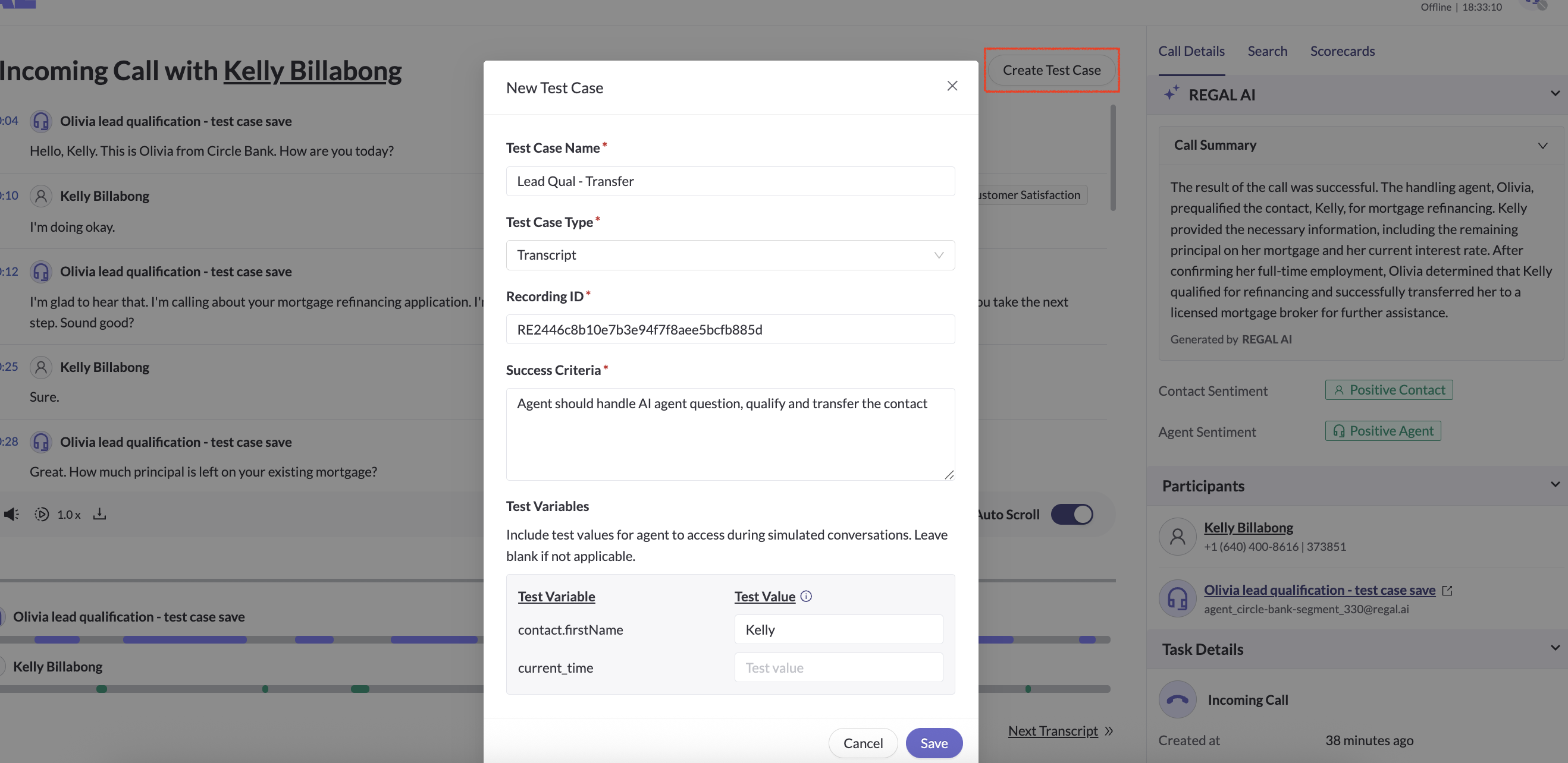 - On any post-call transcripts, hit create test case button.