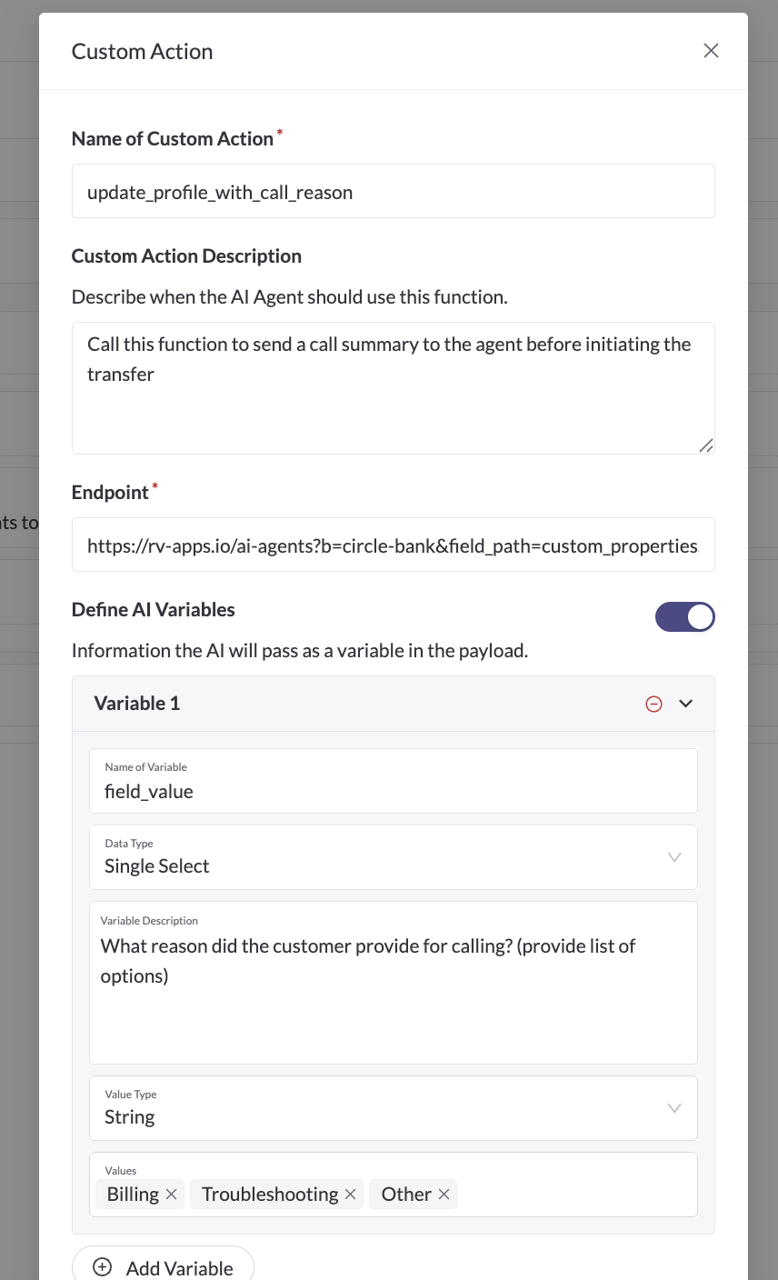 | Define AI Variables | name: field_value // note: this needs to be called field_valuedata type: single-select// note: this can be string or single select depending on your use casevalue type: stringdescription: What reason did the customer provide for calling? value options: Billing, Troubleshooting, Other |