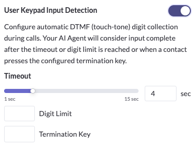AI Agents can collect keypad input entered by callers using DTMF during a call. This allows callers to provide numeric or symbolic input using their phone keypad instead of speaking.